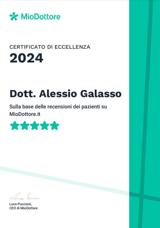 Il lavoro del Dott. Galasso è al quanto difficile e faticoso, soprattutto con un paziente che ha varie problematiche come me ma lui, ha sempre fatto tutto con sapienza, umanità e professionalità. Chi ha la fortuna di incontrare questi medici li deve ringraziare sempre per il loro lavoro, la costanza e le cure premurose che hanno rafforzato la loro voglia di vivere, attraverso spiegazioni, parole rincuoranti e trattamenti, anche se dolorosi. Vorrei ringraziare ancora una volta il Dott. Alessio Galasso per tutto quello che ha fatto per me ma soprattutto l’umanità mostrata dall' inizio alla fine di ogni trattamento, senza mai farmi sentire a disagio, rimettendomi in piedi dopo un lungo periodo di grande sofferenza psicofisica.